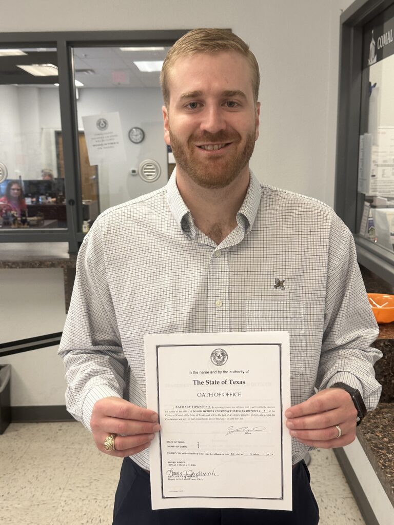 - Zach Townsend attended a meeting with Comal County Emergency Services District #5 and was named commissioner in waiting.