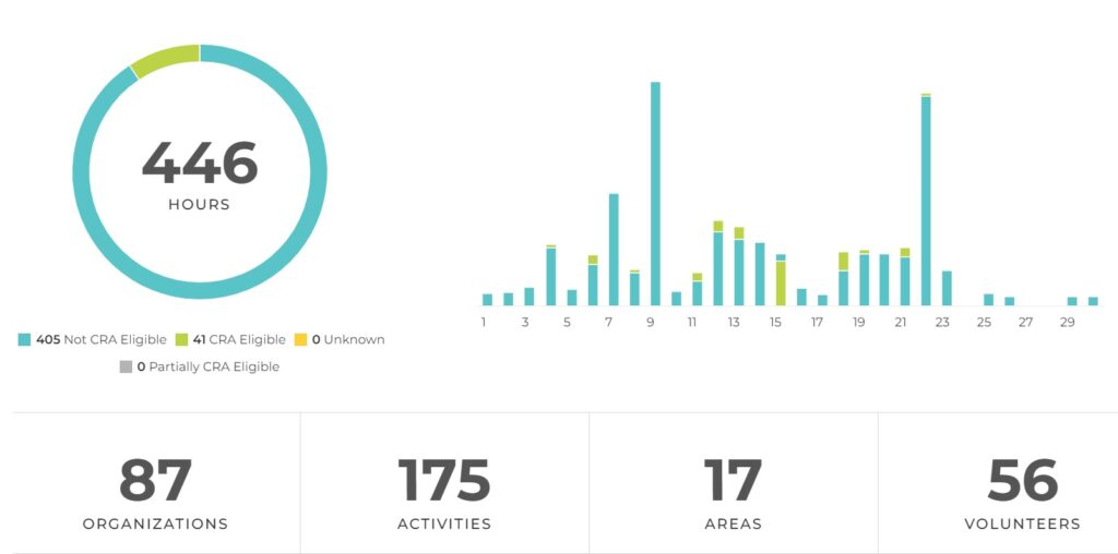 Since we began tracking our service hours, our average number of volunteers each month has steadily increased, yet our highest number of volunteers in any month is 90. We’re reporting impressive numbers of community service each month—with less than a quarter of our team in the game.